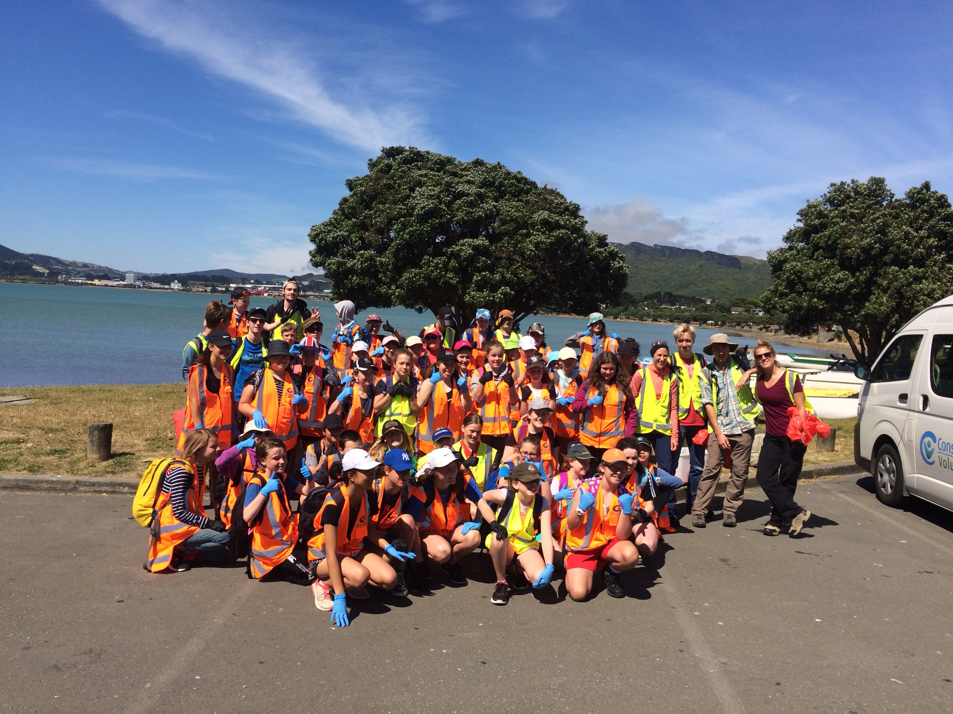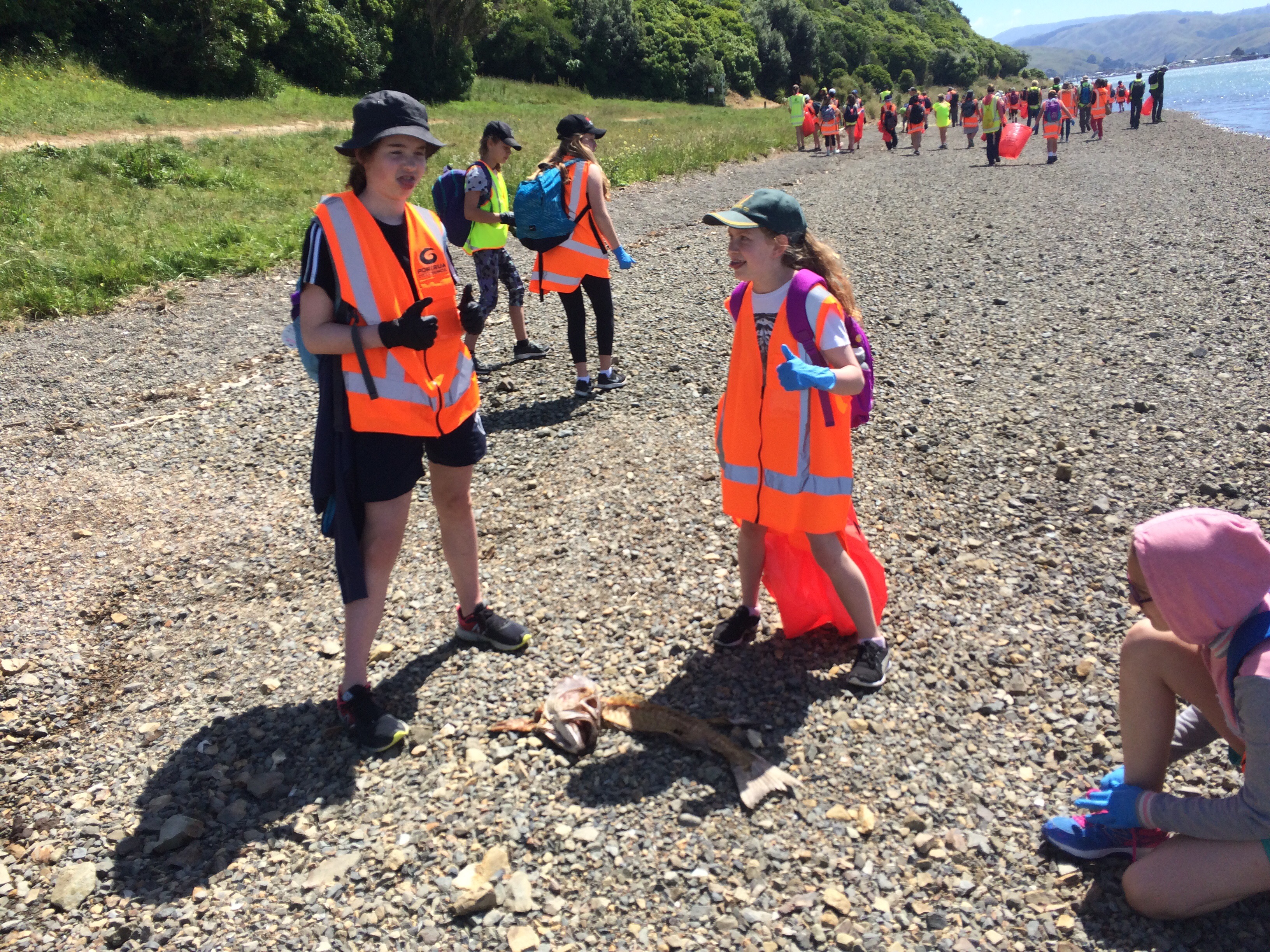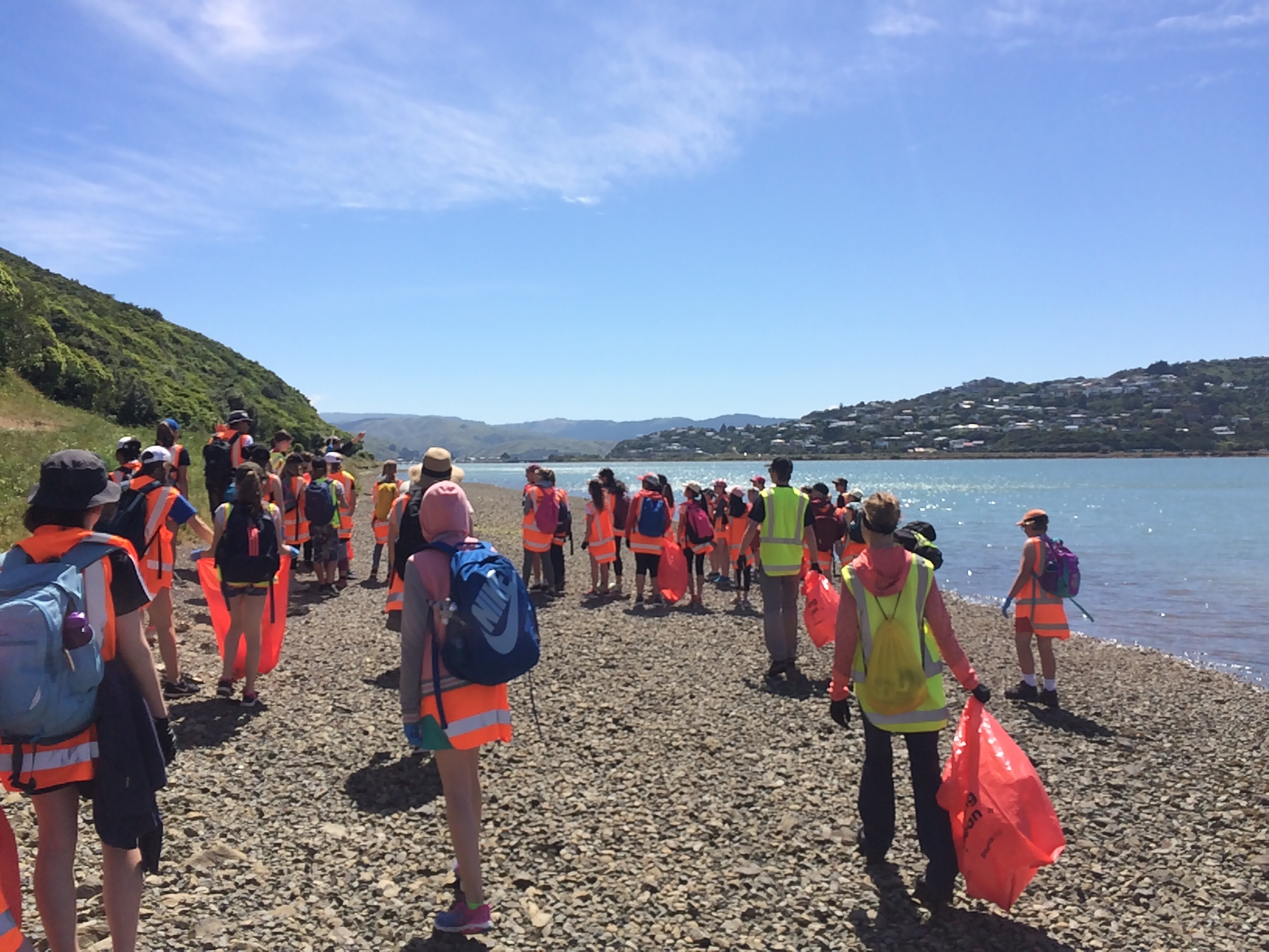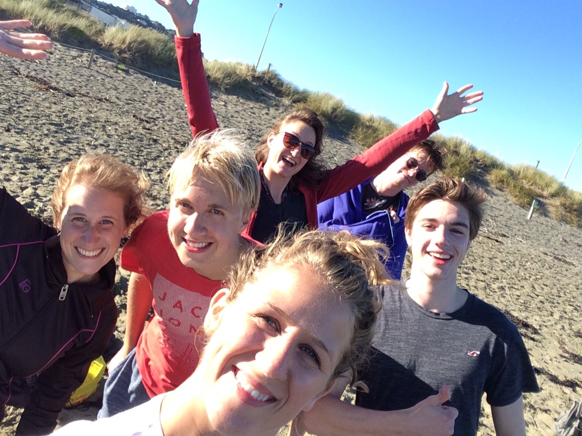 We met a group of 6-7th graders along Titahi Bay. Our job for the day was to clear rubbish* from the coast. I ended up walking with a group of girls who were heaps* of fun to chat with. They were sweetas*. While chatting, we picked up a jandal* , saw some large (dead) fish, and we talked about boots*, trips to the dairy*, futsal*, togs*, and how Americans pronounce words with the letter “a” in them (Example: the name Archie: I say Are-chi and Kiwis say Awe-chi). They got a kick out of my accent as I did theirs. We had fun walking along the coast discussing the differences in our English dialects.